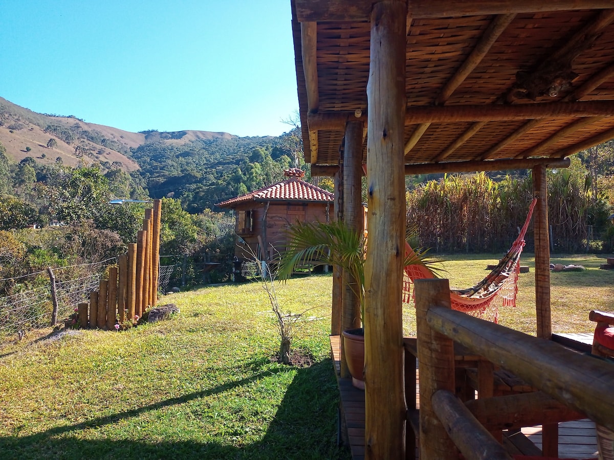 Acorde, assista ao nascer do sol, passe um café contemple a natureza ao seu redor, faça um banho de imersão no ofurô, reconecte-se Relaxe neste espaço aconchegante em meio a natureza na Mantiqueira Mineira. Situado a 1650 metros de altitude a cabana fica no meio da montanha na serra da Mantiqueira, rodeada por um bosque e a 50 metros de uma bica d'água de mina, cujo som de suas águas se houve do deck. É deste generoso deck que se avista a Pedra Preta e parte do Parque Nacional do Itatiaia