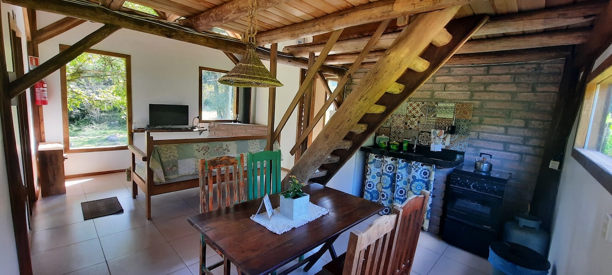 Vivez des journées magiques en pleine nature ! Chalet confortable et espace de charme, parfait pour se reposer et se reconnecter. À proximité des cascades de Garapiá et Forqueta. Il dispose d'un salon avec canapé-lit, télévision, cheminée, livres et jeux. Sur la mezzanine, un lit double et un lit simple. Cuisine équipée avec des ustensiles essentiels pour une expérience agréable. Idéal pour les couples et les familles à la recherche de tranquillité et de bonnes vibrations ! 🐾 Les animaux sociables sont les bienvenus ! Ce sera un plaisir de vous accueillir, vous et votre famille ! 🌿✨