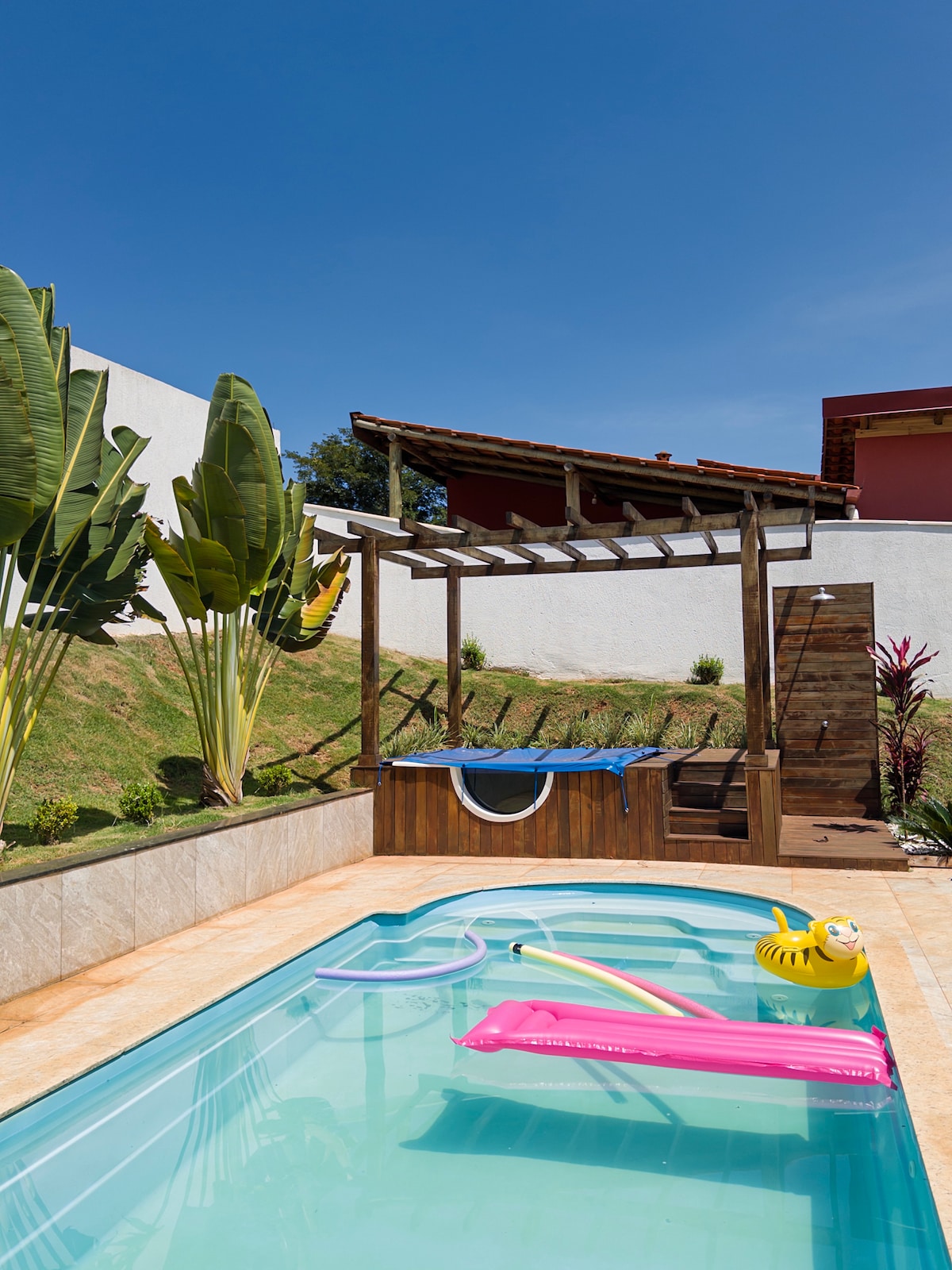 Dîner en famille dans cet endroit élégant. Toute la maison rustique faite de briques et de bois. Très spacieux et avec beaucoup de verdure. Réveillez-vous avec le chant des oiseaux dans un lieu entouré par la nature. Nous avons une piscine, un totem, un saut, une salle de jeux avec plus de 1 300 jeux, un hamac, une balançoire, un toboggan et un cheval jouet pour le plaisir des enfants. Son avec Bluetooth et USB, piscine, télévision connectée avec SKY toutes chaînes débloquées, Internet fibre et un jacuzzi en bois pour se détendre