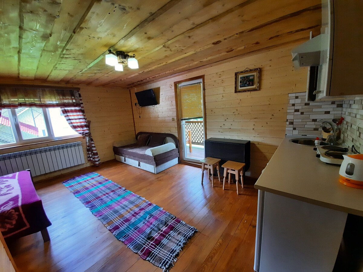 Nous vous offrons un appartement confortable dans les Carpates. Chaque appartement est conçu pour 2 à 4 personnes. La chambre à deux pièces dispose d'un hall spacieux avec une kitchenette et un coin salon, une chambre et une salle de bain. Le hall dispose d'un canapé pliant confortable et d'une table avec des chaises.