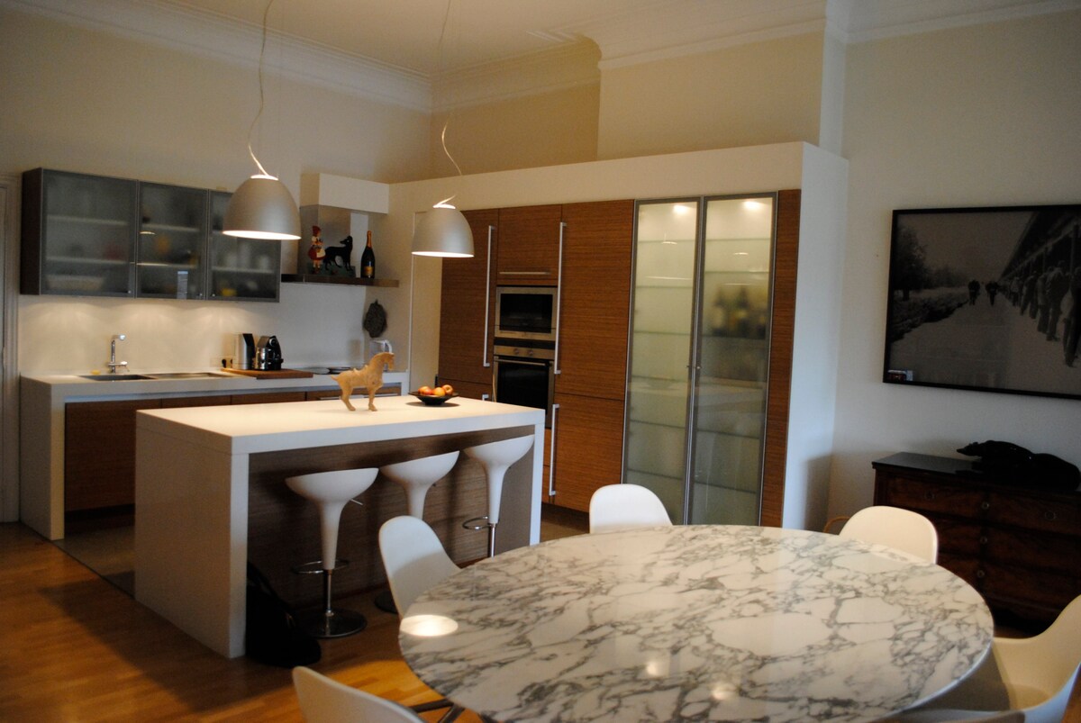 Downtown. Amazing dark loft. 3 nights minimum. Luxuary loft 160m2 : entrance hall, large living room with fitted kitchen, three bedrooms (green room, blue room, red room), wood floor throughout, big black bathroom (central shower and "douchette à l'italienne", two lifts. High-speed Internet, cable TV (Belgacom TV) and many DVD / Blu-ray & books ... Antique, stylish furniture and lots of direct light.