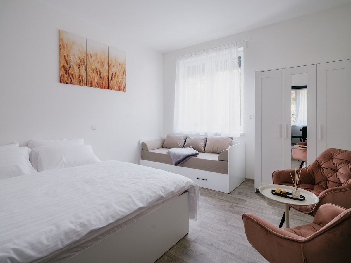 L'appartement moderne et entièrement équipé est situé dans un nouveau bâtiment U Duch hor dans l'ensemble du centre de Harrachov, à 150 mètres de l'ascenseur vers Čertova hora. À proximité se trouve une boulangerie de renommée locale, une pharmacie, des magasins et des restaurants populaires. Climatisation, Internet fort et stable, télévision intelligente avec Netflix, console de jeu, iPad. La salle de bain moderne dispose d'une laveuse et d'une sécheuse.