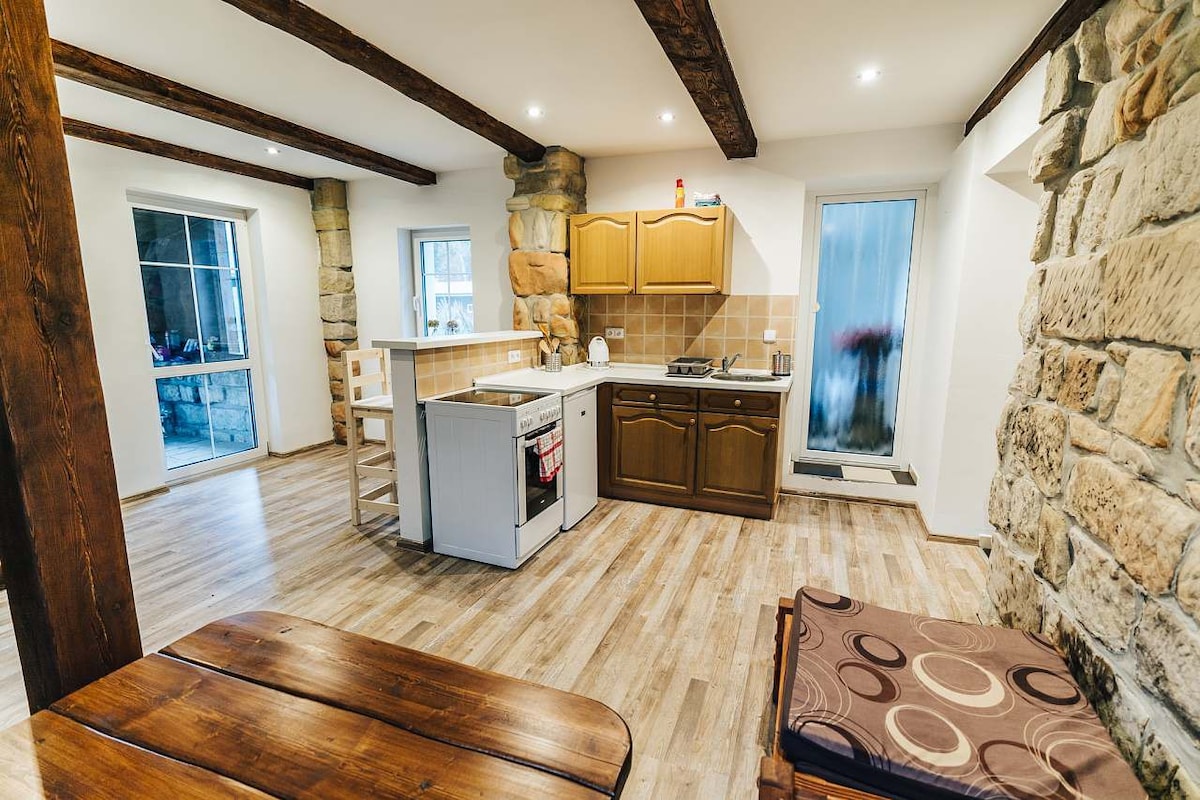 L'appartement est situé en bordure du village entre une prairie et des pâturages, un endroit créé pour la paix et la détente, sur la terrasse il y a une zone calme avec un baril de bain privé, qui est en service toute l'année. L'endroit est situé en bordure des monts Jizera et du paradis de Bohême. Il y a plusieurs pistes cyclables et de randonnée à proximité. En hiver, il est possible d'utiliser les pistes de ski de fond locales et les pistes de Špičák, Čáp, Šachty à proximité.