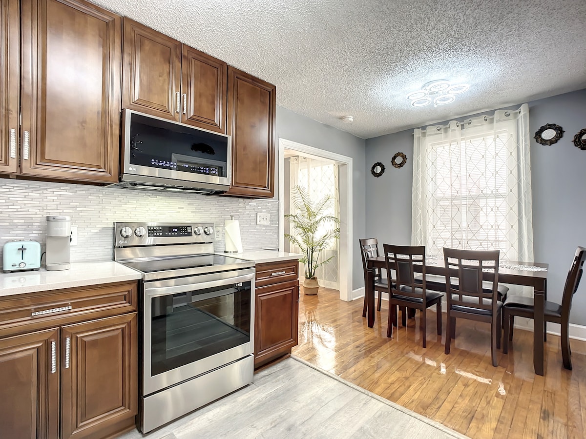 Amusez-vous en famille dans cette élégante maison récemment rénovée. Tout est moderne et FLAMBANT NEUF ! Profitez d'une belle soirée confortable dans le jardin à côté du feu. Nous avons un grand lit king size dans le maître, y compris une salle de bain privée COMPLÈTE avec douche en verre debout. La 2e chambre dispose d'un lit Queen Size à côté de la 2e chambre qui dispose d'une baignoire à l'italienne. Le canapé du salon se retire et fait le lit queen. Chaque chambre dispose d'une télévision connectée avec tous vos émissions préférées.