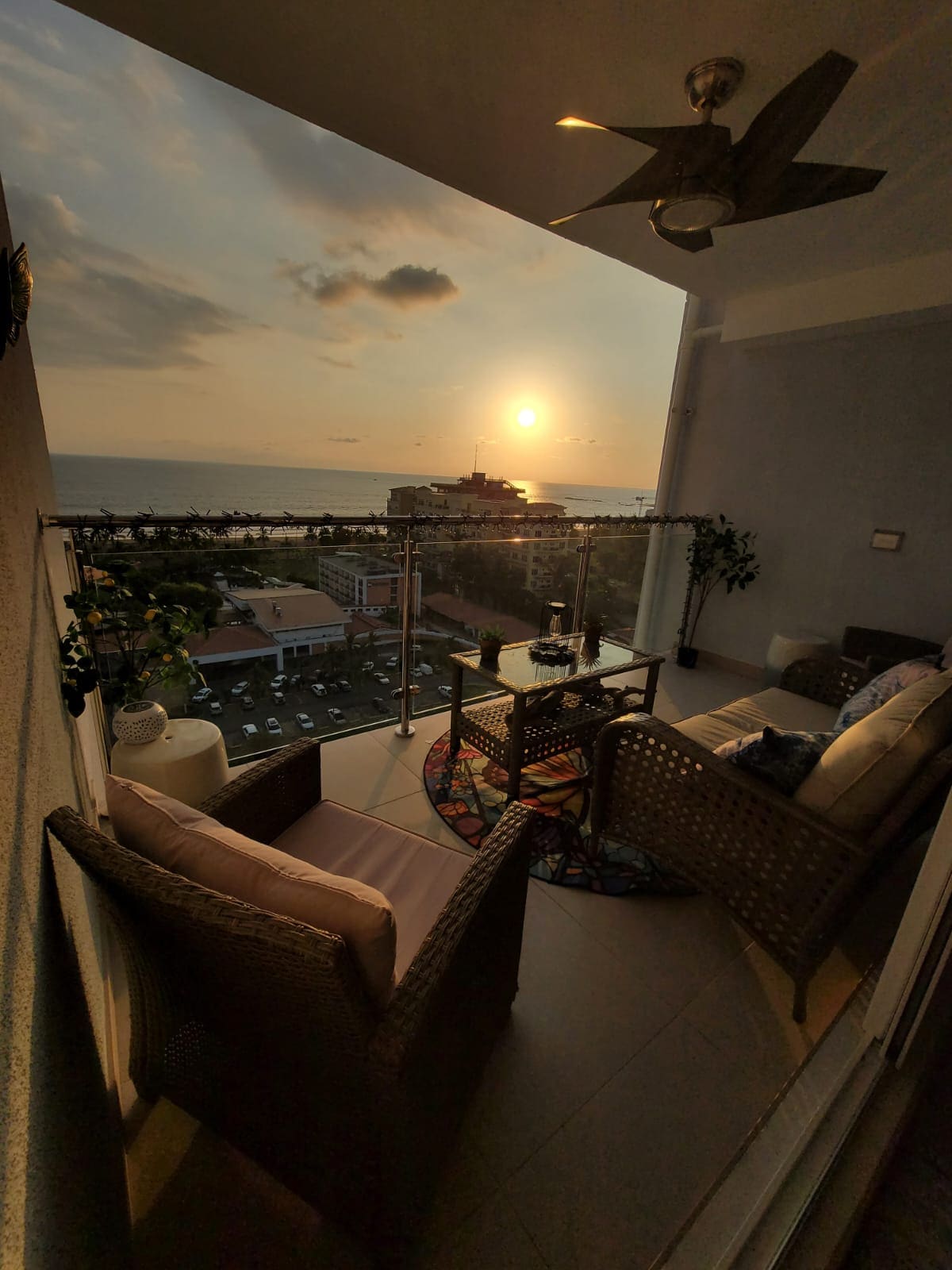 Toit-terrasse avec vue sur l'océan et coucher de soleil