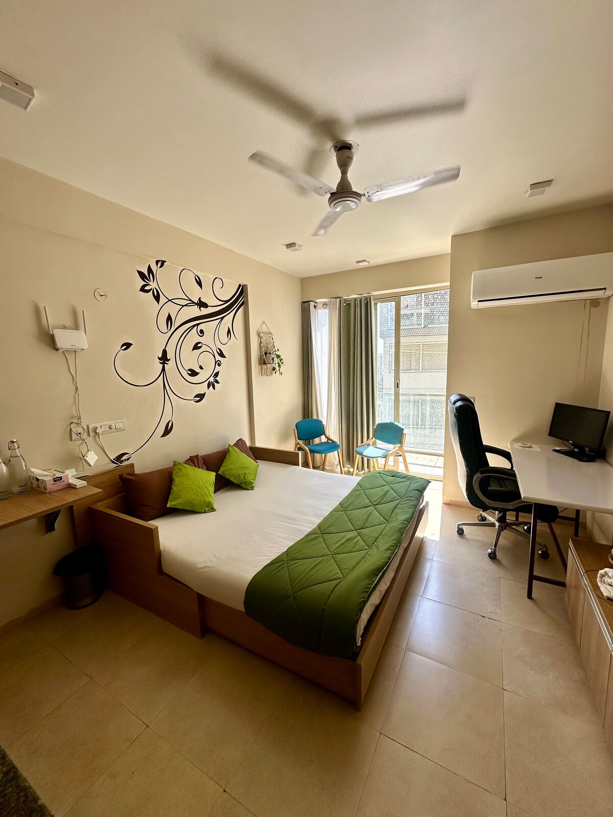Bienvenue dans un havre de paix bohème 5 étoiles, où l'air frais, l'hygiène et la lumière du soleil créent un séjour rajeunissant. Profitez d'un lit super confortable, d'articles de toilette ultra confortables (serviettes, serviettes pour les mains, serviettes pour le visage) et d'une salle de bain impeccable. Travaillez facilement dans un bureau spacieux, un moniteur supplémentaire et une chaise ergonomique super confortable, parfaite pendant de longues heures. Détendez-vous sur le balcon avec une superbe vue et dégustez des repas frais et sains dans notre café interne. Des vibrations positives à mourir ! Réservez maintenant !