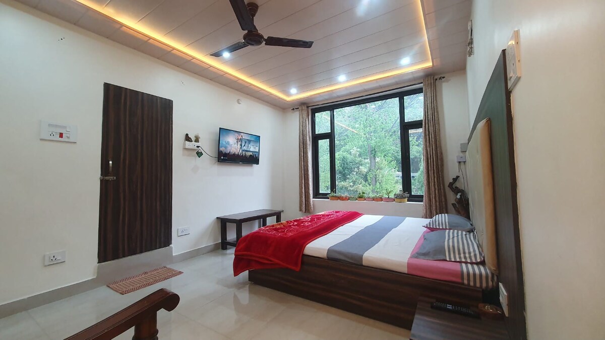 Une chambre privée spacieuse avec une salle moderne attenante. Nous autorisons jusqu'à 2 adultes dans une chambre. Vous êtes entouré de champs verdoyants, de forêts et de montagnes. Réveillez-vous au bavardage des oiseaux et admirez les montagnes enneigées de Dhauladhar. Nous sommes à 1850 m où l'air est si frais que vous oublierez toutes les pollutions de la ville. Notre eau provient directement des glaciers de montagne. Vous pouvez faire de la marche, de la randonnée, de l'observation des oiseaux, de la baignade dans la rivière, de l'observation des étoiles, etc. C'est votre maison dans la nature.