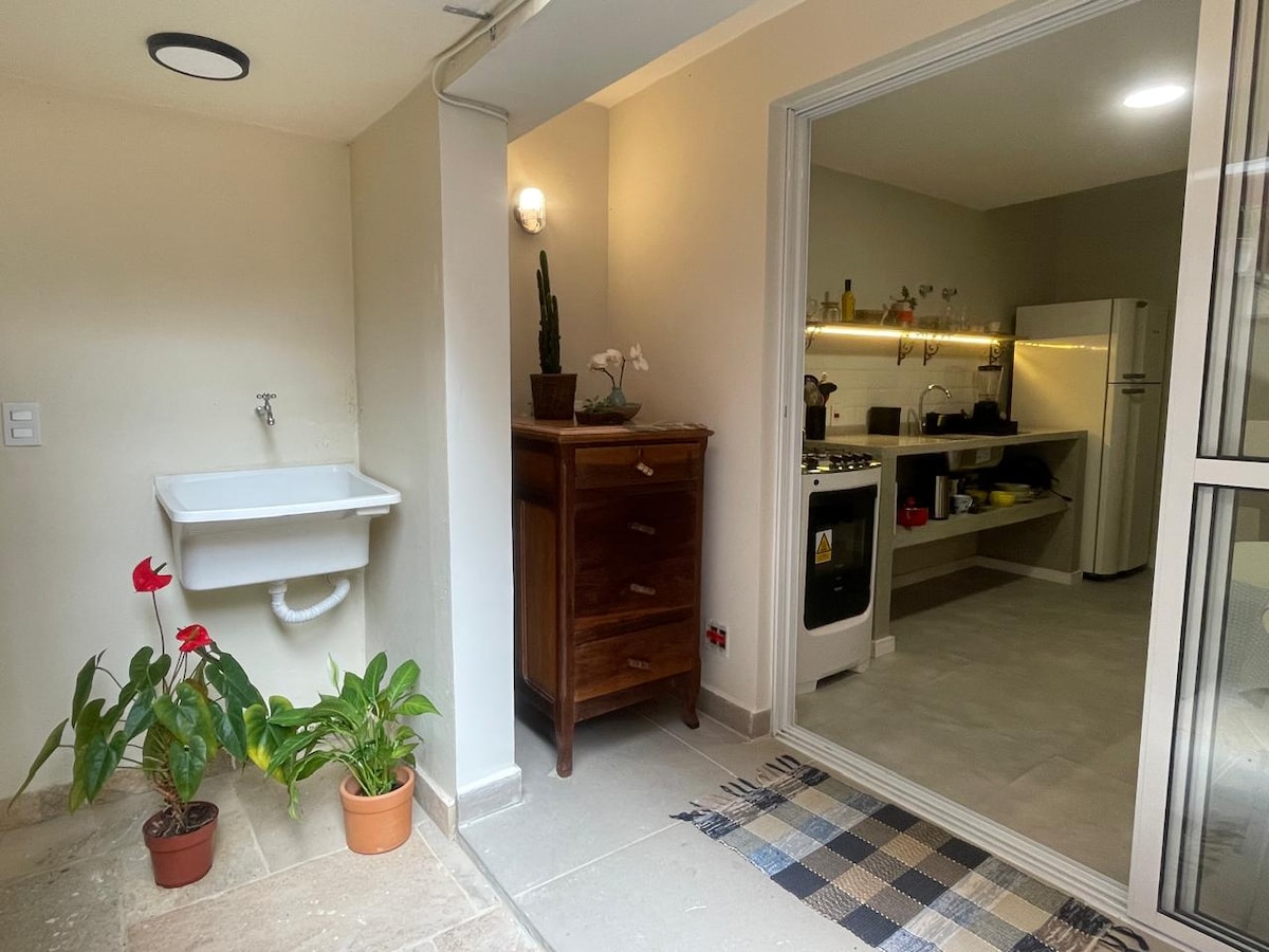 Maison de village (fermée, avec portail) située au cœur de Pinheiros. Maison de village avec accès privé, très sûr, possibilité de stationnement pour jusqu'à deux voitures, animaux de compagnie et famille. Pour oublier la folie de la ville qui ne s'arrête jamais et avoir l'impression d'être dans une maison de plage. Présence d'un singe star (sagui à touffe blanche) qui est sauvage et vit dans les environs et de temps en temps aime visiter la maison, nous l'appelons affectueusement Maurício.