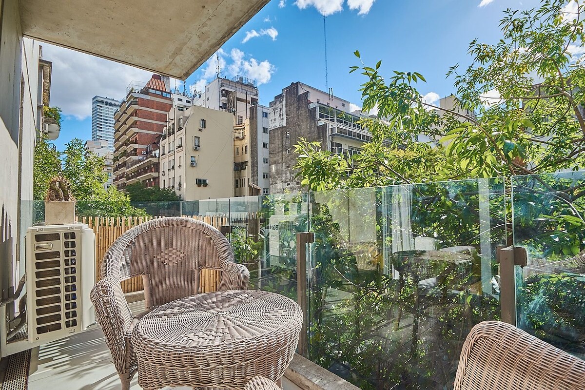 Wake up with the beautiful green view of the trees in the background, in this warm and comfortable apartment in the lively neighborhood of Palermo, surrounded by museums, shops, supermarkets and plenty of nice restaurants/bars to have a drink at sunset...With an unbeatable location it is an excellent starting point to visit the different neighborhoods of Buenos Aires. Building with security 24h/day. Internet speed 100 Mbps The apartment is cleaned with extra precautions and sanitized thoroughly. Apartamento de 50 m2 con vista verde, con balcón, en el corazón de Palermo. Tiene 1 dormitorio con cama matrimonial y 1 sillón cama de 1 plaza en el living. Black out en dormitorio y living. Posee caja de seguridad. Excelente ducha. Equipado con Internet Wi-Fi, posee 2 TV : una de 42" en el living y otra de 32" en la habitación con Netflix, 2 aires acondicionados, calefacción, microondas, tostadora, 1 gran heladera, cafetera y termo eléctrico, tender extensible para el secado de la ropa, plancha y tabla de planchar. El departamento ha sido reformado en mayo 2016, esto incluye pisos nuevos, colchón nuevo de alta calidad así como ropa blanca. En diciembre 2016 se colocó una cocina nueva, eléctrica. Me encuentro disponible en el celular para cualquier solicitud, consulta o recomendaciones sobre la ciudad de Buenos Aires o sobre el departamento. Apartment located in a safe and lively area, with a fantastic location that includes green spaces and an important gastronomic and cultural center very much appreciated of the city. Near the main cultural and touristic attractions. Steps from all means of public transport. Walking distance to Malba Museum. Only 10' from the Jorge Newbery National Airport. Ubicación muy práctica para moverse en BA con todos los medios de transporte públicos a 3 cuadras en Av.Las Heras y a 1 cuadra en Av.Libertador. Personas adicionales sin cargo. Se hace una limpieza general por semana con cambio de ropa blanca sin cargo. El departamento tiene puerta blindada y abajo en la recepción hay guardias de seguridad las 24h. Posee caja de seguridad.