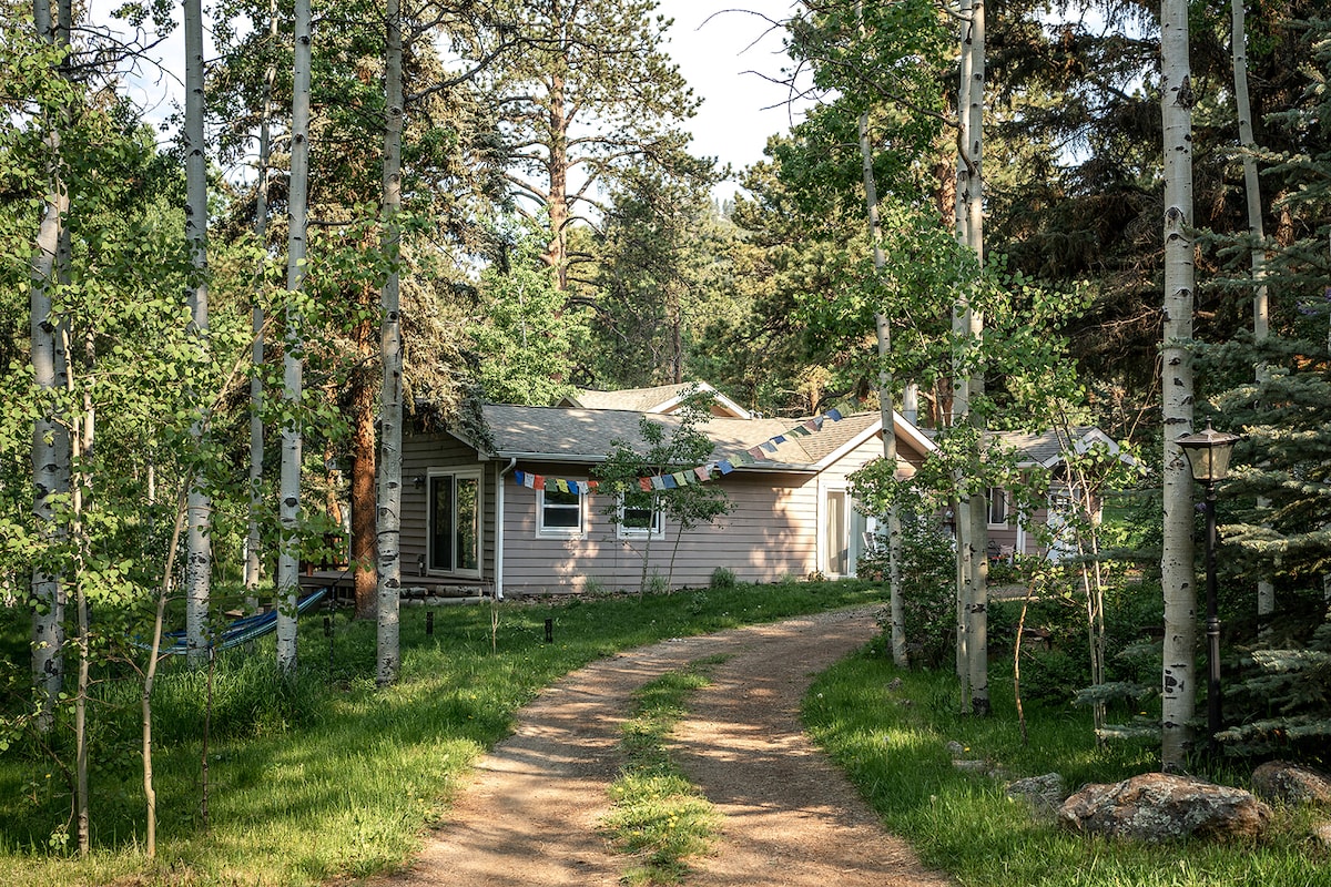 Reconnectez avec la nature dans cette retraite paisible remplie de lumière naturelle et de décor bohème. Entourée de bosquets de trembles et de vieux pins, votre suite parentale dispose d'une entrée privée, d'une cheminée confortable et d'un bain à remous d'hydrothérapie. Passez vos journées à lire dans le hamac, à regarder un coucher de soleil sur votre terrasse privée et à explorer les sentiers locaux. Cet espace est niché dans les contreforts, ce qui vous permet d'explorer Denver, d'assister à un concert à l'épique Red Rocks Amphitheater (20 min) ou de trouver une aventure dans les montagnes.