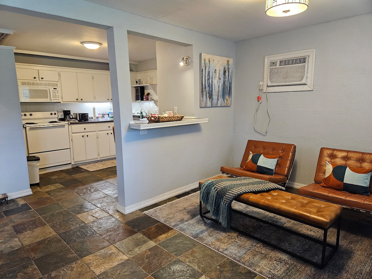 Cet espace est un studio indépendant de 400 pieds carrés derrière une maison de 2 chambres. Lit double, salle de bain complète et coin cuisine. Grille-pain, micro-ondes, mini-réfrigérateur/congélateur et cafetière Kurig dans le logement. J'ai également inclus une plaque chauffante et des casseroles/poêles pour une cuisson minimale. Tout neuf, mur très calme A/C. Rideaux occultants, propres et frais Télévision murale avec bâton de feu Amazon et wifi rapide.