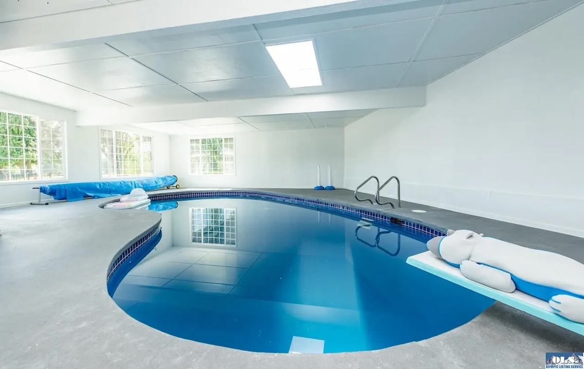 A luxe modern coastal home on the beach with a heated indoor pool and spa with sweeping views of Discovery Bay, Protection Island, the Strait of San Juan De Fuca, and a lagoon. Located in the rain shadow directly between Port Townsend and Sequim. Pool & Spa are heated year-round, Pool at 85 degrees, Spa at 100 degrees. Enjoy Sequim and Port Townsend. 4 kayaks and a rowboat to launch from the private beach.