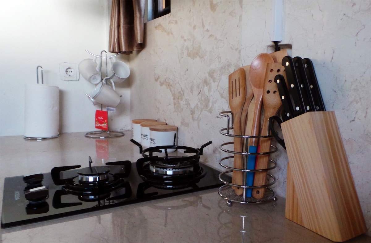 L'appartement avec vue sur le jardin est l'un des trois appartements d'une villa calme de deux bâtiments. De la fenêtre de la kitchenette, vous pouvez voir de Sumbul Beach jusqu'à Medewi Point. Il s'agit d'un espace de vie luxueux et isolé d'une chambre au rez-de-chaussée conçu et proposé à un prix pour les occupants à long terme. Il est plein de tous les équipements modernes que vous pourriez souhaiter, y compris un cinéma grand écran projeté et un accès à l'ensemble du complexe de la villa, y compris le salon panoramique, le four à pizza et la piscine.