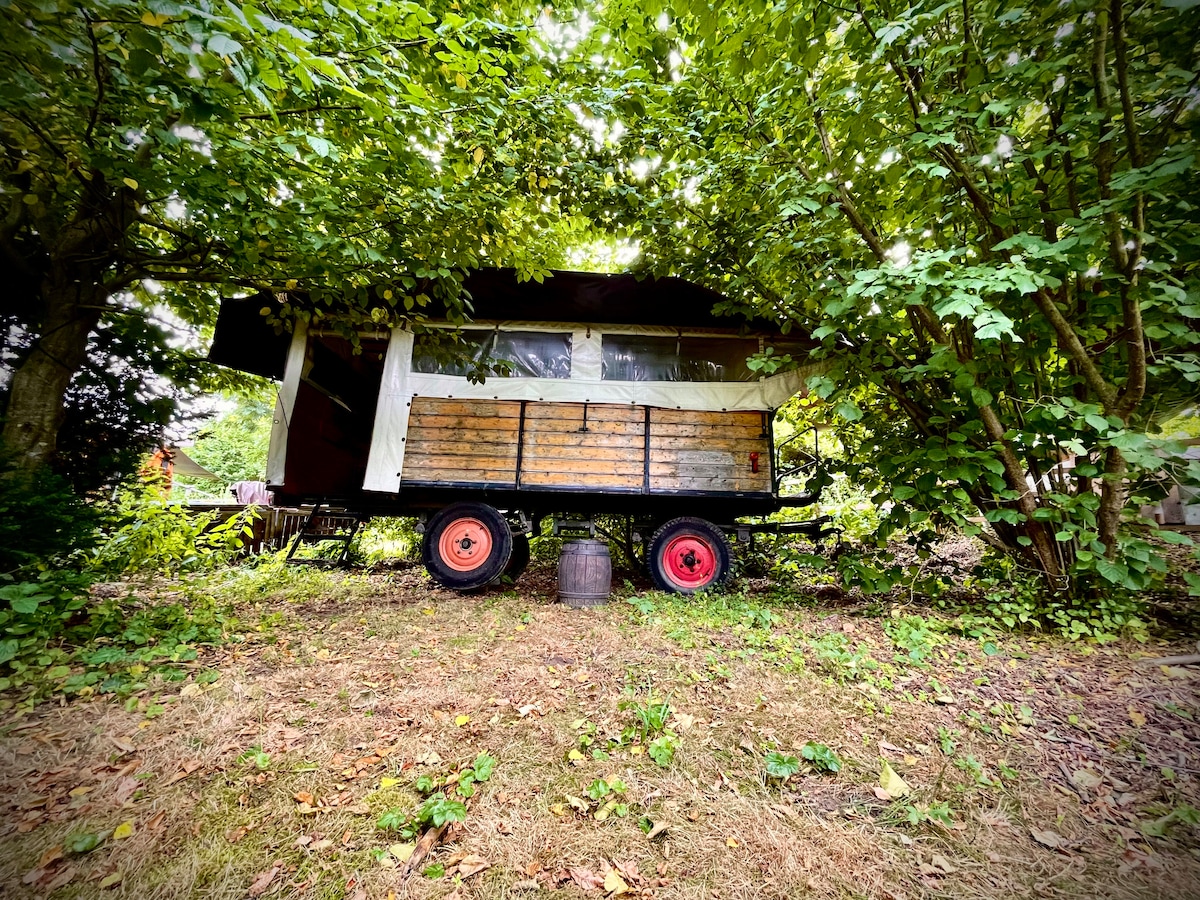 Une cabane aventureuse et romantique de plus de 30 mètres carrés avec un confort simple + debout seul. Cuisine de base avec électricité. Accessoires, sommeil, salon et espace extérieur. Vous y trouverez également une salle de bain partagée dans le grand voyageur Hogan. LA terrasse : Une place ensoleillée surplombant 2 hectares de forêt et de prairie, la vallée et le Wolfshundereere. Le prix est valable pour 1 personne, merci de demander des forfaits / plusieurs personnes séparément. Réservable du printemps à l'automne.