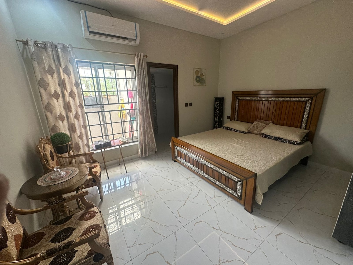 Profitez d'un séjour luxueux au cœur de Citi Housing Jhelum. Cet appartement moderne d'une chambre dispose d'un lit king size, d'un salon élégant, d'une télévision LCD, d'un canapé et d'un magnifique balcon. La cuisine est équipée d'un réfrigérateur et d'un four à micro-ondes pour passer un séjour agréable. Parfait pour les couples, les voyageurs en solo ou les voyageurs d'affaires à la recherche de confort, d'intimité et d'une expérience haut de gamme.