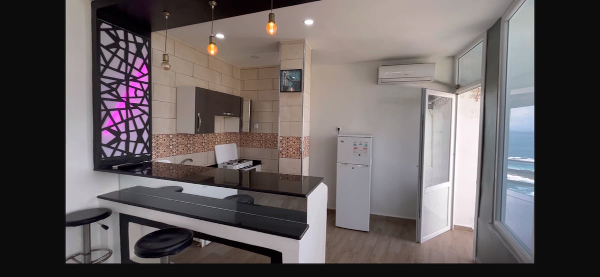 Résidence VacanSea propose un superbe appartement équipé avec terrasse situé en plein front de mer beaumarché au centre ville de Jijel, il a une vue splendide sur la corniche DJIJELIENNE. le studio dispose de toutes les commodités pour passer un agréable séjour à Jijel. NB: Carnet de famille obligatoire ÉTAGE : 6/6 sans ascenseur