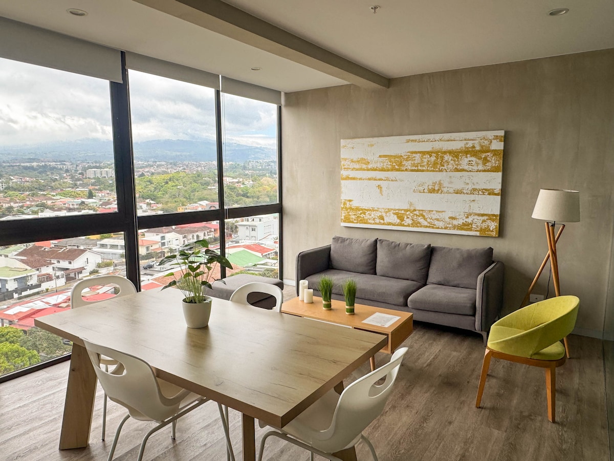 Studio moderne dans la tour Ifreses, San José Studio flambant neuf avec un lit Queen Size, un canapé et une télévision connectée de 50 pouces. Cuisine entièrement équipée, lave-linge et sèche-linge, et piscine sur le toit. À deux pas du supermarché Automercado et des cafés. À 11 minutes du centre-ville de San José en bus ou en Uber.