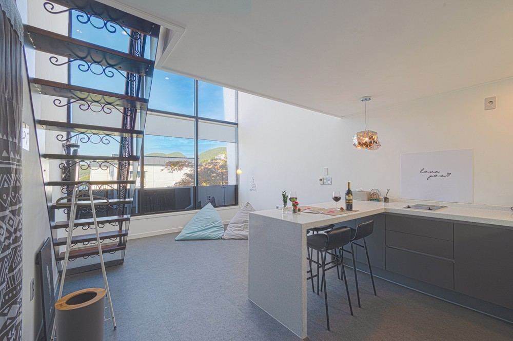 Chambre n° 104 avec un intérieur moderne et propre, bain en plein air individuel, barbecue individuel, duplex privé