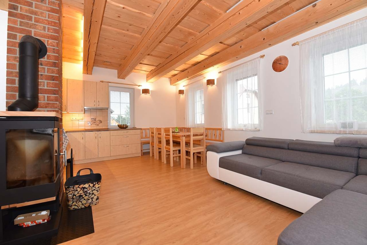 Ce logement élégant est parfait pour les personnes qui veulent se réveiller avec vue sur les montagnes et vous voulez également vous détendre dans des intérieurs uniques qui vous permettent de calmer vos sens. Les maisons sont en bordure d'une petite campagne pittoresque dans les contreforts de Jizera. Notre avantage est un grand espace commun avec un salon, une cuisine et une salle à manger, ainsi qu'une terrasse avec une vue imprenable sur les montagnes géantes. Nous sommes entourés de conte de fées et de terres magiques ! Apprenez à le connaître et tombez amoureux des montagnes de Jizera autant que nous ! bienvenue à Ania et Sławek