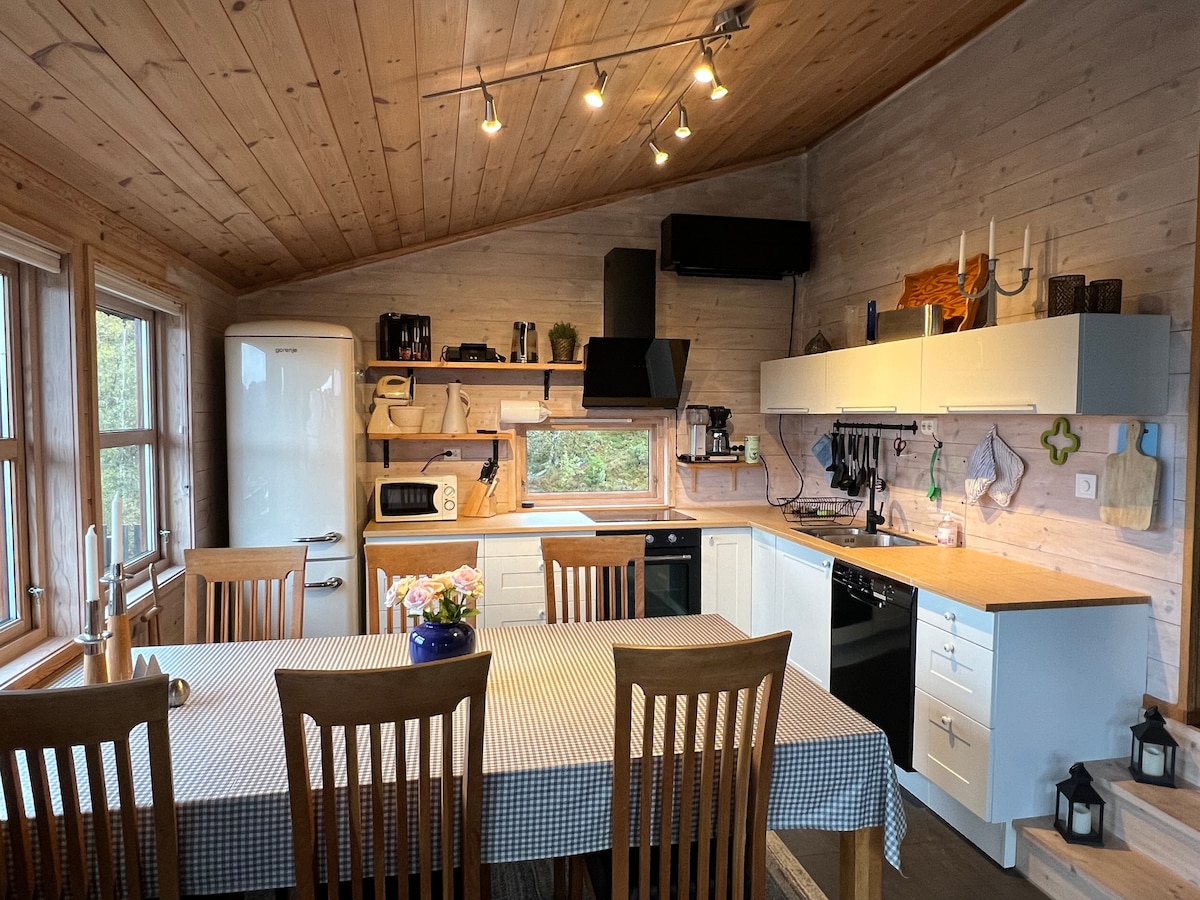Belle maison de vacances de plain-pied, bien située sur le terrain, à une courte distance de la mer. Vue imprenable et ensoleillée du matin au coucher du soleil. Situé dans un quartier calme, à seulement 30 m du parking. (20 min en voiture du départ de la randonnée de Pulpitrock) Porte pliante à l'avant et deux grandes portes coulissantes donnent la possibilité de s'ouvrir à la nature à l'extérieur. Possibilités de pêche et de baignade à seulement 120 m du chalet. Poêle à bois intérieur et foyer au bois extérieur. Toutes les chambres disposent d'un pare-soleil occultant.