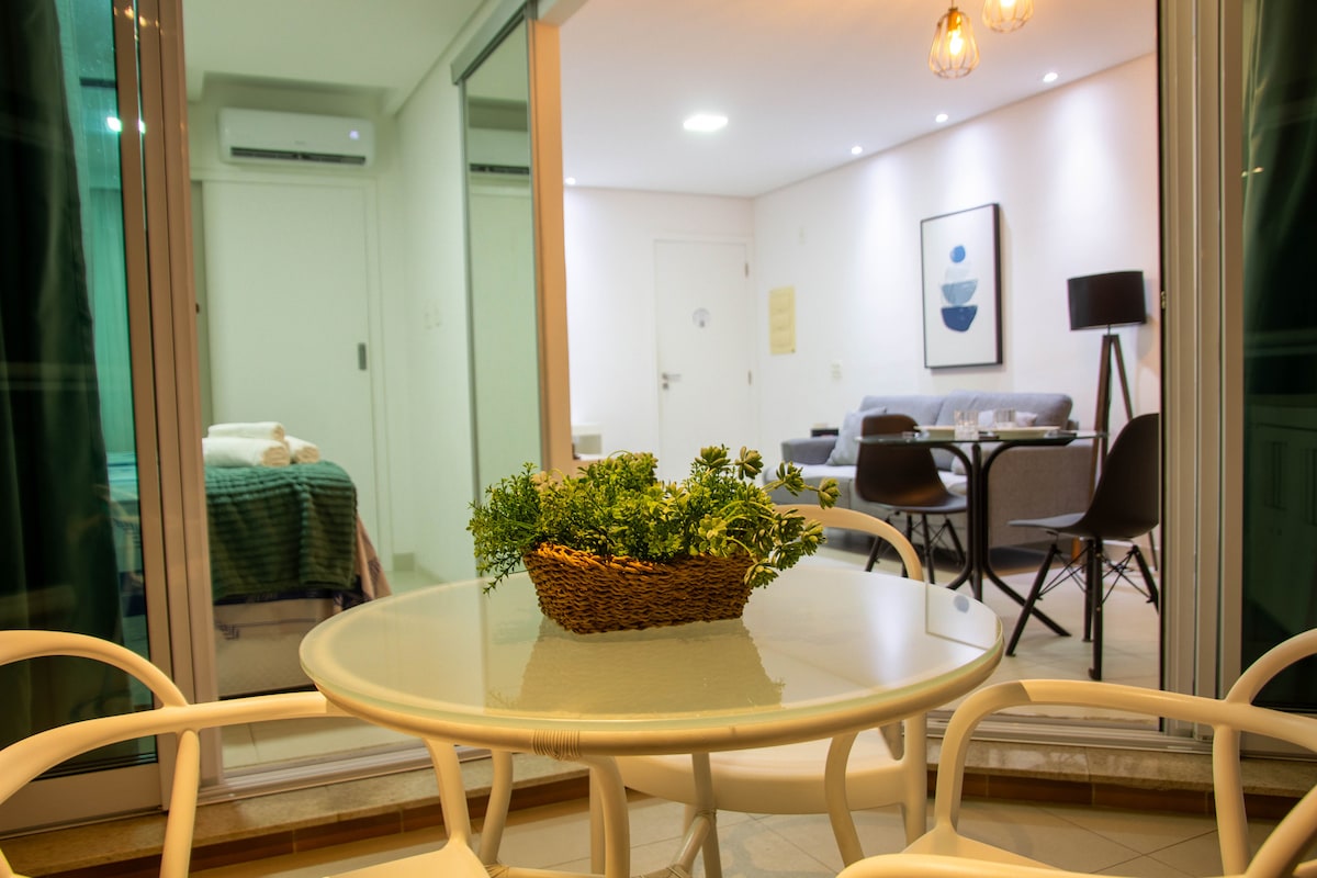 Appartement d'une chambre (46,30 m2) situé dans un grand centre de loisirs avec un bon service et des installations de bien-être incroyables (piscines, spa, salle de sport et plus encore). Emplacement remarquable, juste au bord de l'océan. Une connexion Wi-Fi est disponible dans l'appartement ainsi que dans les zones de réception et de loisirs. À côté du supermarché Pão de Açúcar, ouvert tous les jours de 7h à 23h (café et restaurant rapide à l'intérieur).
