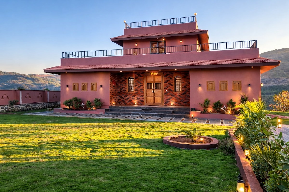 « Villa Elsewhere » est une luxueuse et belle villa avec piscine privée, à seulement 60-90 minutes en voiture de Mumbai. Entouré d'une vue verdoyante sur les champs, les collines et les sons de la nature. La villa dispose de 3 chambres climatisées, d'un grand salon climatisé qui s'ouvre sur une piscine privée et d'une grande terrasse avec un bar. La cuisine est entièrement équipée et un chef peut y préparer de délicieux repas (*frais supplémentaires). Les animaux de compagnie sont acceptés (* en supplément). RÉSERVEZ pour vous détendre dans une ambiance calme et paisible, pour une réunion ou pour accueillir des voyageurs dans le meilleur des cas !