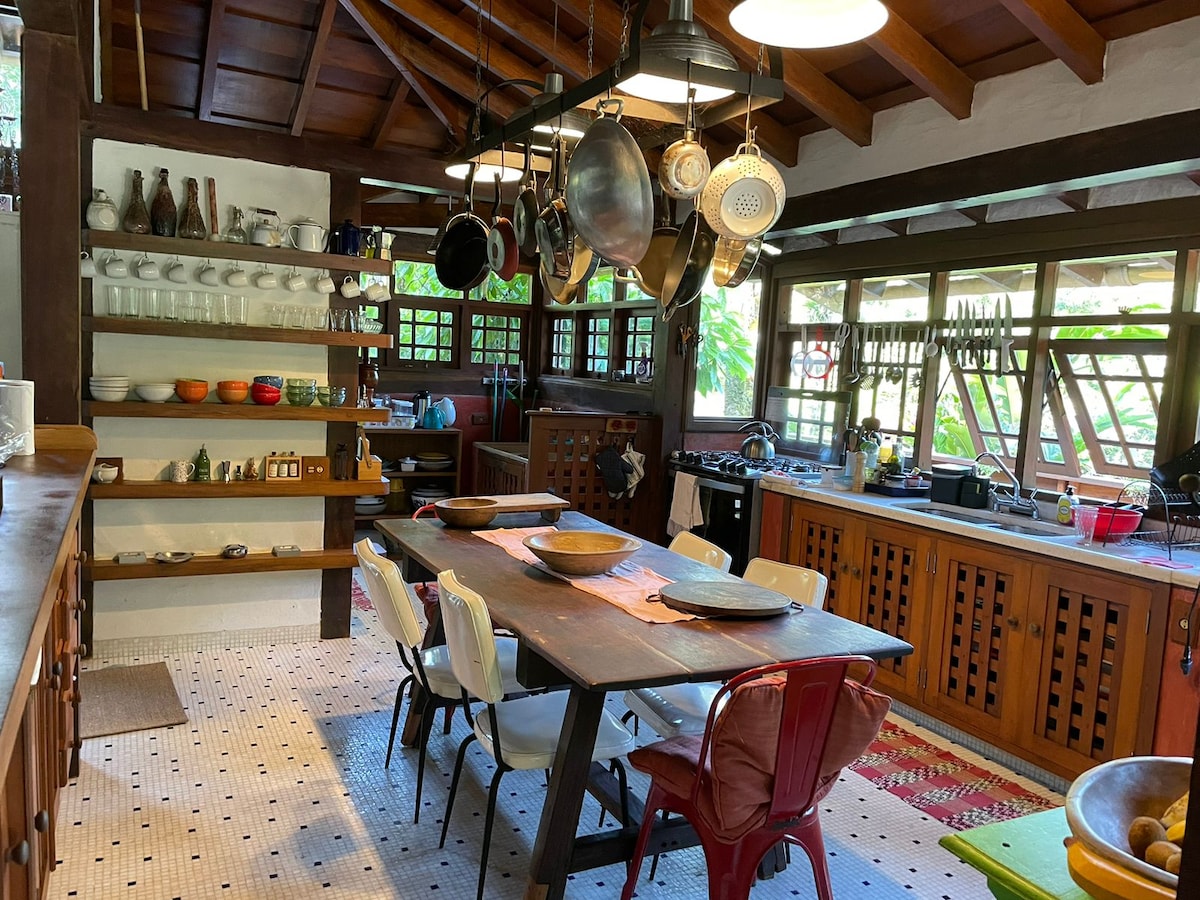 La maison est dans la forêt, entourée par la nature, les cascades et les oiseaux. Elle a une structure en bois avec une finition rustique, une cuisine complète, étant très confortable et chaleureuse ! Nous avons 3 chambres pouvant accueillir jusqu'à 12 personnes, un grand espace de loisirs au milieu de la verdure, avec piscine, barbecue, ainsi que des sentiers avec accès privé à un ruisseau. Proximité des marchés et de la plage. Ambiance parfaite pour beaucoup de repos, de connexion avec la nature et de loisirs ! Idéal pour les familles et les groupes d'amis !