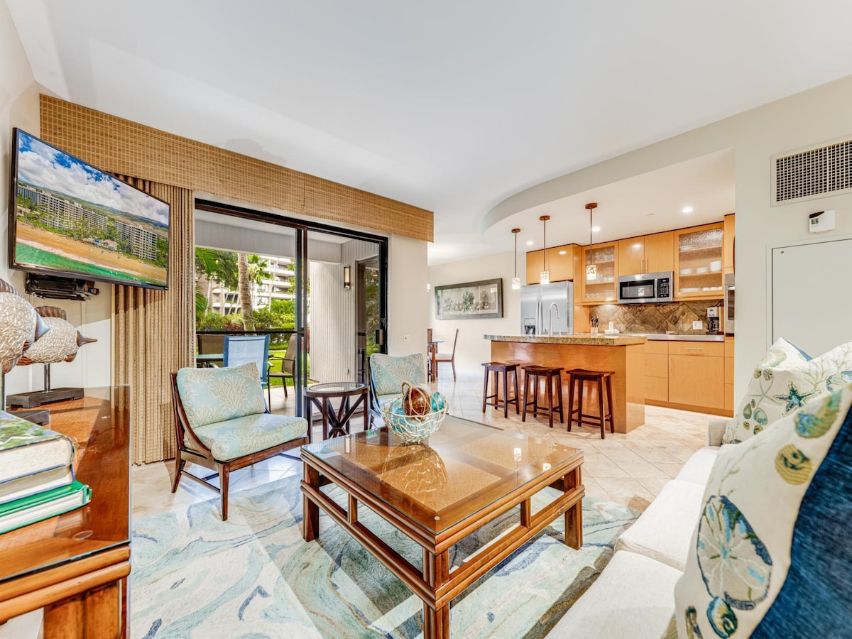 Propriété et exploitation locales Condo 1 CH/2 SAL avec le meilleur emplacement direct en bord de mer, vue panoramique sur l'océan, les couchers de soleil et l'observation saisonnière des baleines. Le propriétaire n'a épargné aucune dépense pour rénover ce logement, ce qui en fait l'un des plus beaux de tout le Mahana. Réveillez-vous avec la brise tropicale fraîche et les sons du rivage à seulement 50 pieds. Les baies vitrées du séjour et de la chambre offrent une vue imprenable et font entrer le chaud soleil de Maui tandis que la climatisation centrale vous garde au frais à l'intérieur.