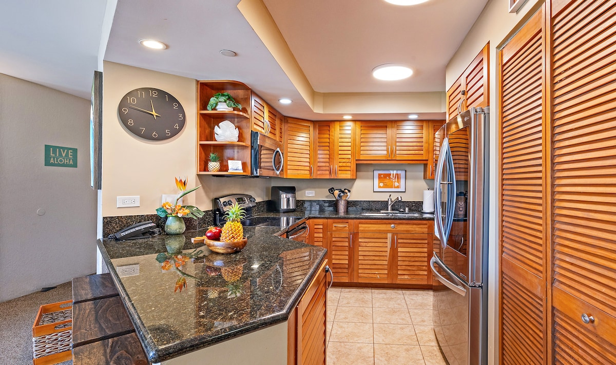 Évadez-vous dans un coin de paradis – où le fairway rencontre l'océan. Cette copropriété magnifiquement aménagée offre le meilleur de la vie à Kaanapali, avec un emplacement privilégié face au parcours de golf, des vues sereines et panoramiques et une vue partielle sur l'océan étincelant qui vous coupera le souffle. Réveillez-vous en admirant les golfeurs qui s'élancent sur les parcours de golf de renommée mondiale de Kaanapali. Dans l'après-midi, détendez-vous sur votre lanai privé et regardez le coucher du soleil peindre l'océan Pacifique dans des teintes d'or et d'orange.