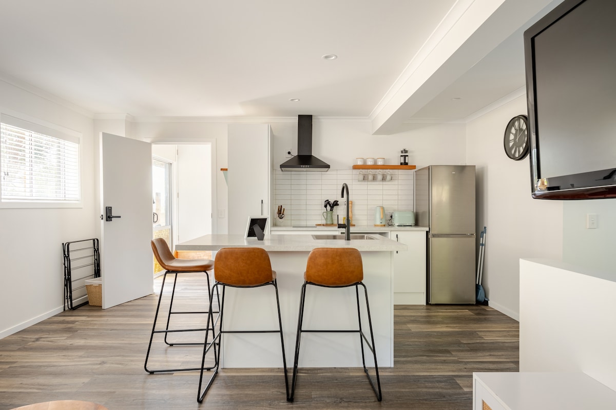 Kiwi architectural moderne niché sur le bord d'un lagon à marée entre Ligar Bay et Tata Beach. Le Bach est un logement compact de 55 m² avec une grande terrasse abritée et couverte avec du soleil toute la journée. Une chambre principale est reliée à un salon compact et à une salle de bain attenante, à une salle à manger et à une cuisine de chaque côté, le tout avec une vue complète sur l'eau et le lagon. Il y a une capsule de couchage séparée avec un lit queen size à 2 mètres de l'habitation principale pour 2 personnes supplémentaires. Incroyable deuxième douche extérieure chaude sous les arbres.