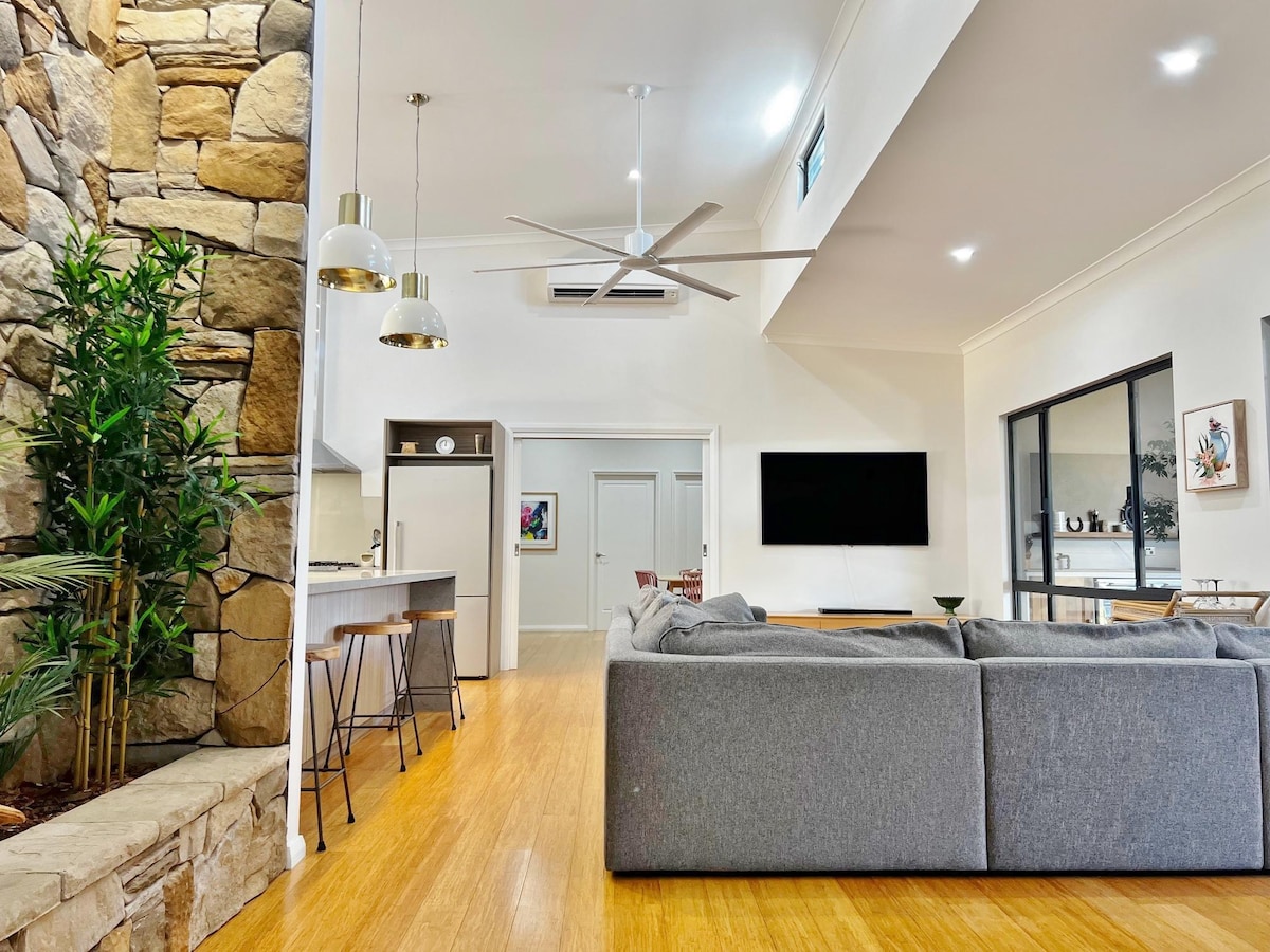 This one-bedroom bungalow is just a 300-metres walk from the town centre, river, cafes, and IGA. - bedroom with air conditioning - kitchenette with cooktop and microwave -TV -Washing machine Relax in the private yard featuring a picnic seat and mulberry tree. Please note, the yard is still being completed, so price has been reduced to reflect this. This is located downstairs of our house however, is completely private with seperate driveway, own entrance and yard.