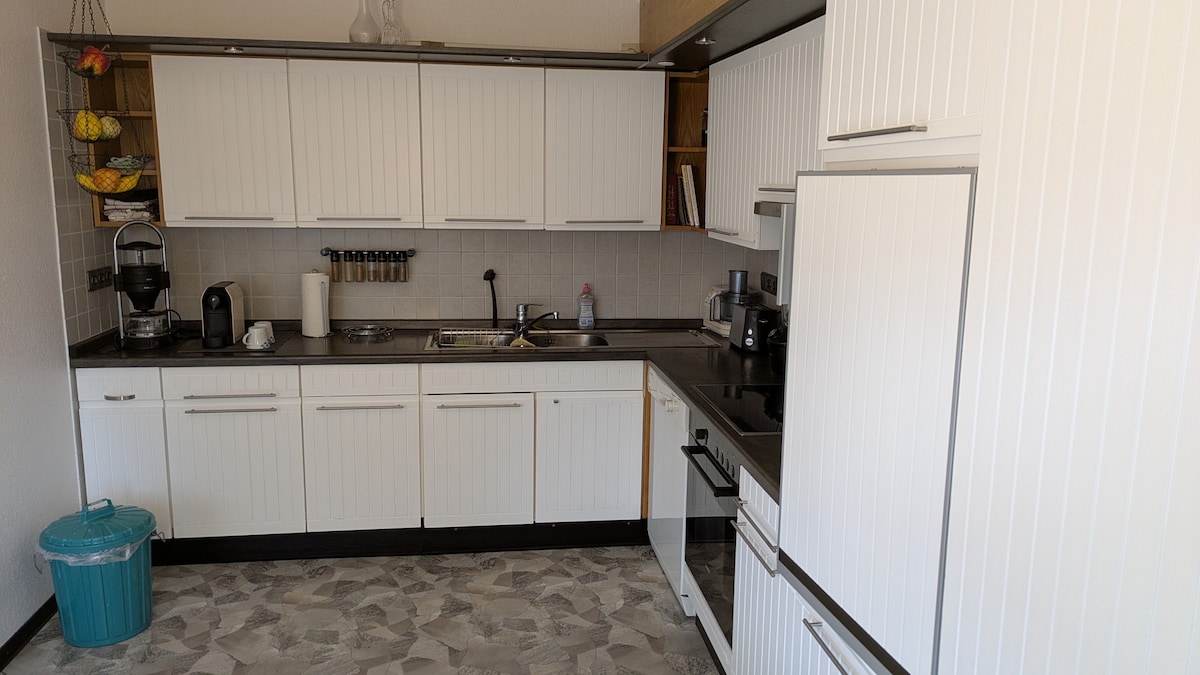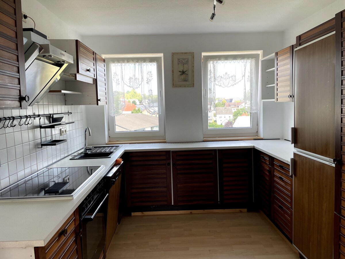 ** Appartement indépendant lumineux avec vue sur la nature** Notre appartement indépendant lumineux au 1er étage situé au bord des prairies et des champs offre de la place pour 3-4 personnes (+bébé sur demande). Il comprend une chambre avec lit boxspring king size, un salon avec télévision, canapé et lit supplémentaire. La cuisine entièrement équipée, une salle de bains à la lumière du jour avec douche ainsi qu'un lecteur DVD et des jeux de société créent une atmosphère de bien-être. Machine à laver dans la pièce séparée. Draps et serviettes de toilette inclus. Nous vous attendons avec impatience !