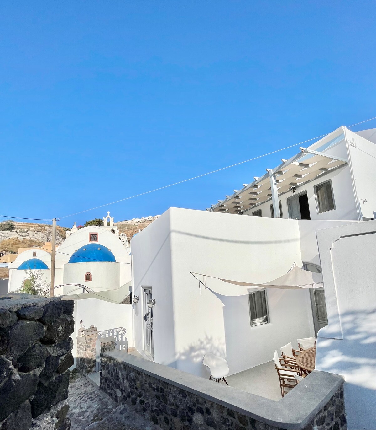 La maison est située dans la meilleure partie de la plage de Kamari. Une route semi-privée vous y conduit. Vous pouvez prendre un bain de soleil sur la terrasse privée tout en profitant de la vue sur la mer. Bien qu'isolé, le village, la plage, une boulangerie et un mini-marché sont accessibles en 3 minutes à pied. Nous fournissons tous les deux jours un service de nettoyage et des serviettes de plage, changeons les serviettes de bain tous les jours et les draps tous les deux jours. Dans la cuisine, il y a une machine à expresso, des capsules d'expresso.