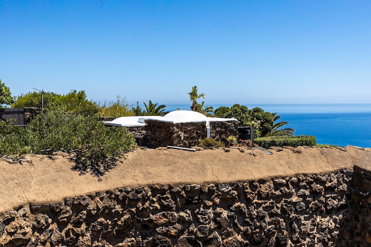 Ancien dammuso rural avec vue sur la mer et piscine