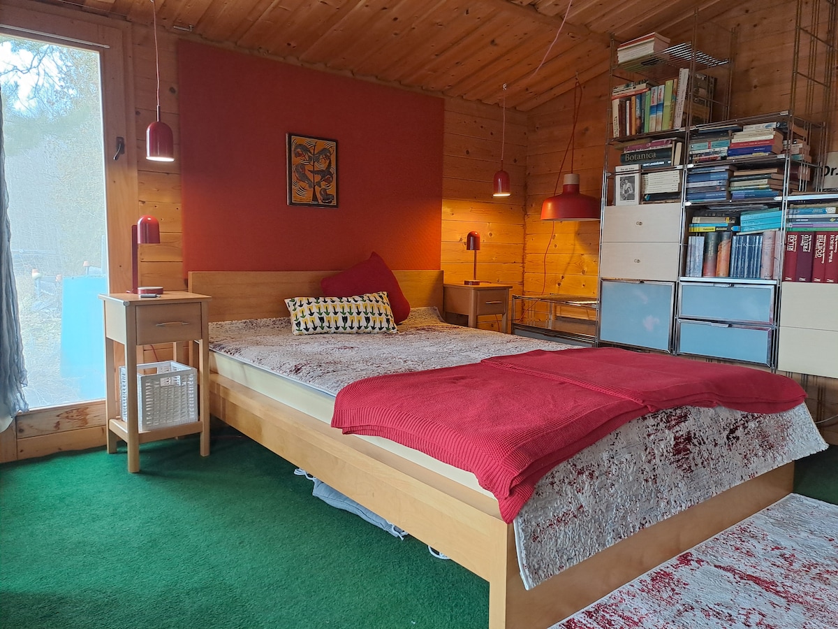 Stille, Weitblick und Naturverbundenheit. Eine Etage nur für dich. Mit Studio, Küche, Dusche und WC. Gesamt rund 70m². Direkter Zugang zu einem 150m² großen schattigen Garten. Wasser direkt aus einer Waldquelle. Das sonnendurchflutete Holzhaus wurde 2018 gebaut, grenzt direkt an einen Wald an und befindet sich entlang des österreichischen Jakobsweges. Besonders freuen wir uns über Menschen die einen Zugang zu Spiritualität haben. Für die Praxis stehen Meditationskissen und Yogamatten bereit.