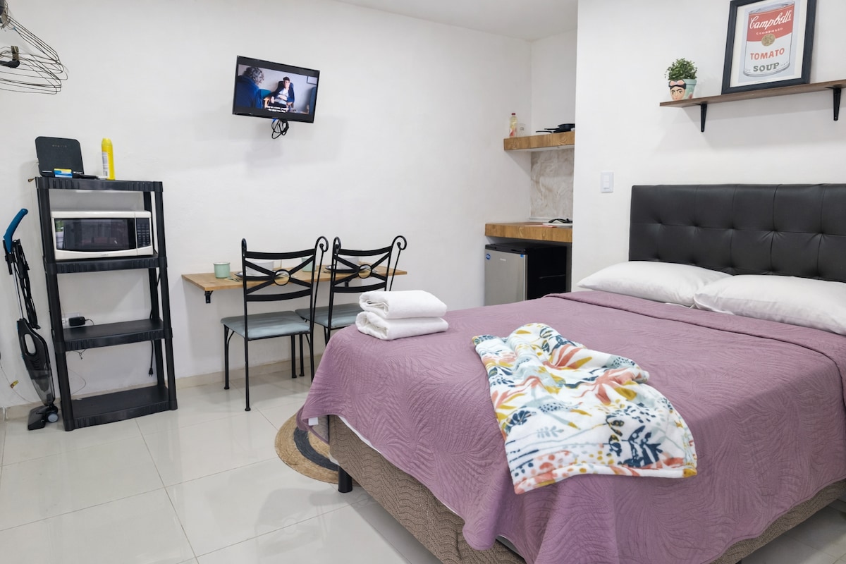 Bienvenue dans l'un des meilleurs hébergements au cœur de Mérida. Découvrez le design, la fonctionnalité et la tranquillité dans un appartement privé exclusif. Profitez d'un grand salon avec TV, d'une salle à manger à côté d'une cuisine 100 % équipée, d'une salle de bain privée pour un usage personnel. Détendez-vous dans la suite avec lit King Size et placard pour vos effets personnels, elle dispose d'une mini piscine privée pour se détendre. Notre énergie provient de panneaux solaires, démontrant notre engagement envers la durabilité.