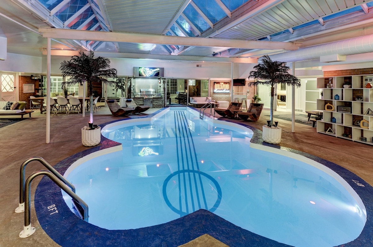 Il s'agit d'une maison unique en son genre pouvant accueillir 10 personnes. Notre maison dispose d'une piscine intérieure chauffée en forme de guitare, qui est ouverte toute l'année pour votre divertissement. Suivez-nous sur IG pour toutes les mises à jour à ELVISRETREATHOUSE. Dans la salle de la piscine, vous trouverez une table à manger, un énorme gril à 6 brûleurs et de nombreux endroits pour vous détendre autour de la piscine. De plus, nous avons une salle de jeux avec table de billard/ping-pong, des jeux d'arcade, un bar et une télévision.