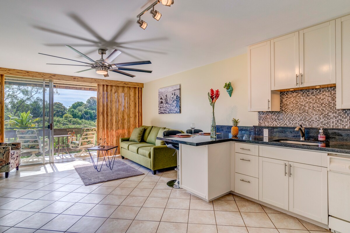 Ce merveilleux hébergement est destiné aux amoureux de la nature qui aiment le luxe. Il dispose d'une belle terrasse qui donne sur de majestueux grands arbres et un feuillage vert luxuriant avec une baignoire romantique pour deux. Au centre de la pièce se trouve un lit king-size sur mesure en bois de cerisier et orné d'une literie luxueuse. Il y a une cuisine complète et un coin repas avec vue pour un endroit tranquille pour partager un repas. C'est le vrai style hawaïen où vous pourrez profiter d'une vie insulaire confortable, élégante et décontractée.