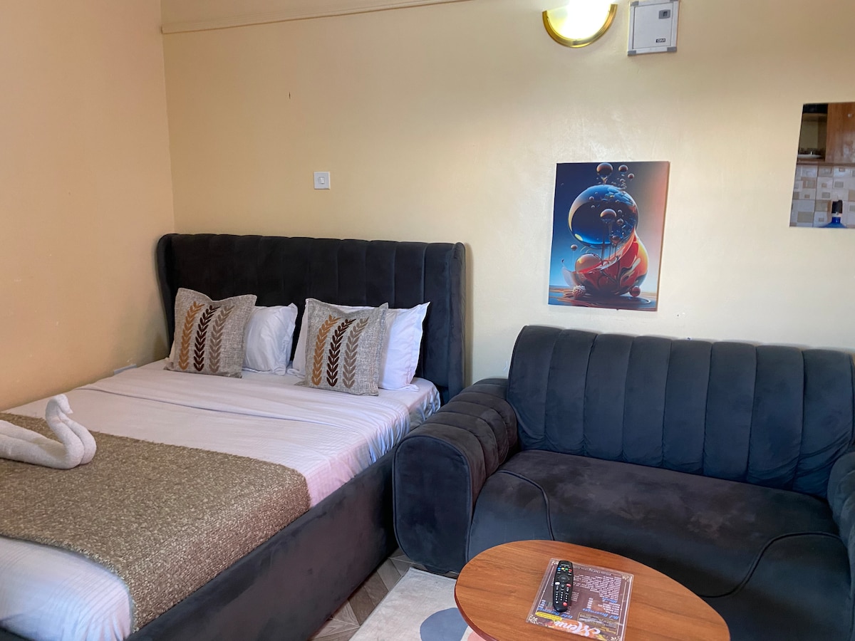 Parfait pour les couples ou les voyageurs en solo ! Détendez-vous dans ce studio élégant et confortable à quelques minutes seulement du Buffalo Mall Naivasha. Idéal pour les voyages d'affaires ou de loisirs, le logement peut accueillir confortablement 2 voyageurs, offrant une escapade paisible avec une touche chaleureuse et contemporaine. Que vous assistiez à une conférence, que vous profitiez d'une escapade romantique ou que vous passiez simplement en ville, vous adorerez l'accès facile aux boutiques, aux restaurants et aux joyaux pittoresques de Naivasha tout en vous détendant dans le confort et l'intimité.