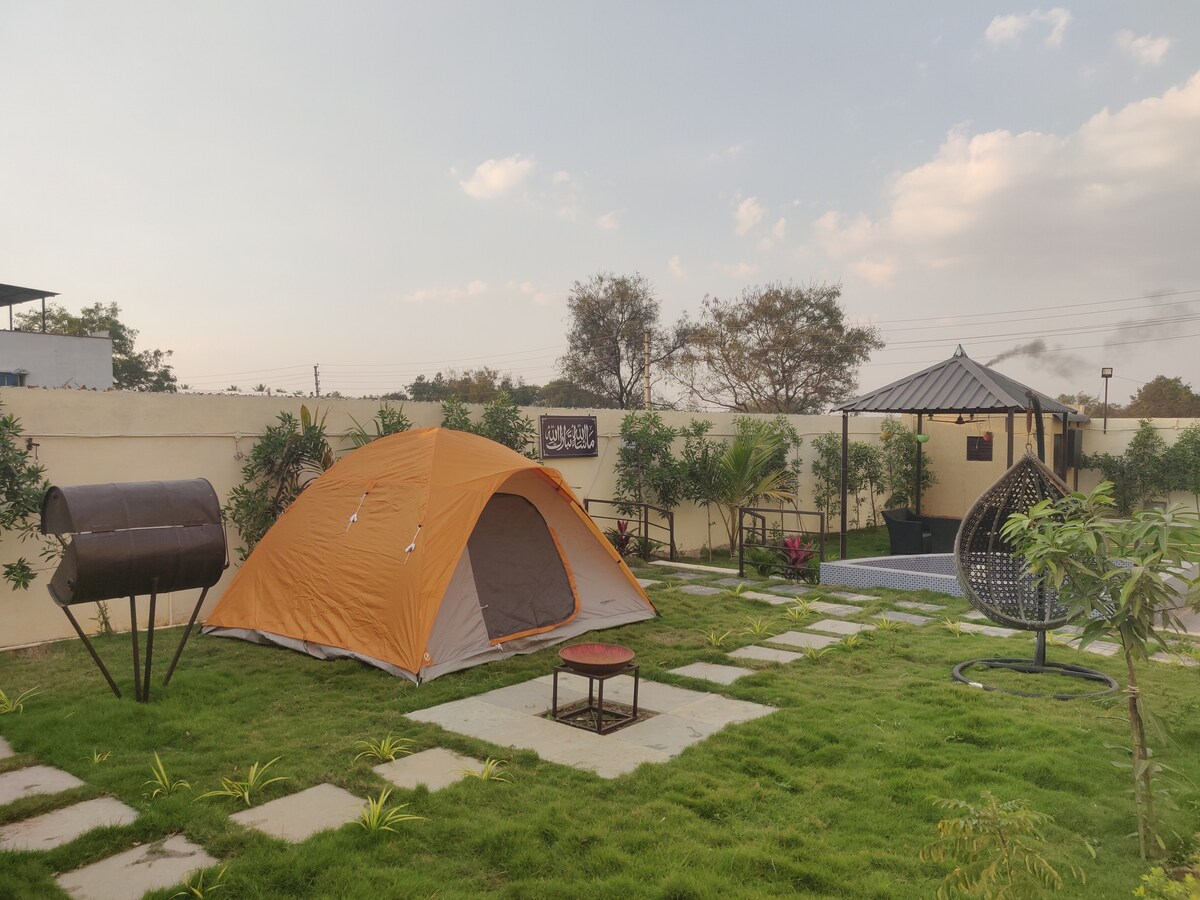 Notre propriété de ferme de 2 acres est situé à la périphérie de Bangalore - à 50 km en voiture de la ville électronique. Il fait partie d'un domaine de 33 acres et est entouré de nature : montagnes, arbres, ciel clair et lac à l'avant. Un bel endroit où vous pourrez vous détendre avec vos amis et votre famille, une escapade parfaite loin de la vie urbaine ! Nouvelle PISCINE maintenant ouverte ! ! ! Vous pouvez profiter d'un feu de camp, d'un barbecue, de l'observation des étoiles, du camping, des jeux d'intérieur et d'extérieur. Nous avons maintenant clôturé notre propriété, elle est donc sécurisée pour les enfants et les animaux de compagnie.