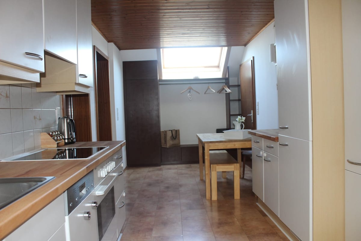 Confortable appartement mansardé de 75 m² au 3ème étage avec 2 chambres, 1 lit double, 1 lit superposé avec 3ème couchage gigogne et un espace de travail. Le logement dispose d'une cuisine entièrement équipée, d'un salon avec une télévision 3D à écran plat, d'une connexion Wi-Fi gratuite et d'une salle de bains moderne avec un lave-linge. Serviettes de toilettes à prévoir. Notre jardin avec sa propre aire de jeux invite à la détente. Un parking et un local à skis sont disponibles.