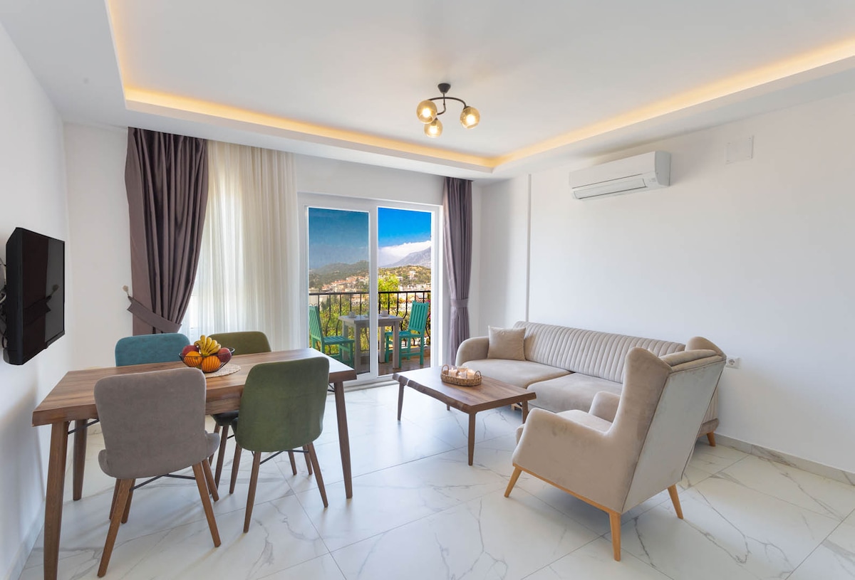 Situé dans le centre de Kaş, avec une vue magnifique sur Kaş avec sa mer bleu profond, ouvert en 2021, notre appartement a été conçu de manière à ce que vous puissiez vous sentir à la maison et facilement atteindre tout ce dont vous avez besoin dans cette direction. Nos appartements offrent à nos clients un plaisir de vacances inoubliables. avec 60 m2 de chambres séparées. Climatisation, équipement de cuisine complet, lave-vaisselle, lave-linge, kit intégré, équipement de salle de bains, groupe assis, mobilier de balcon, TV
