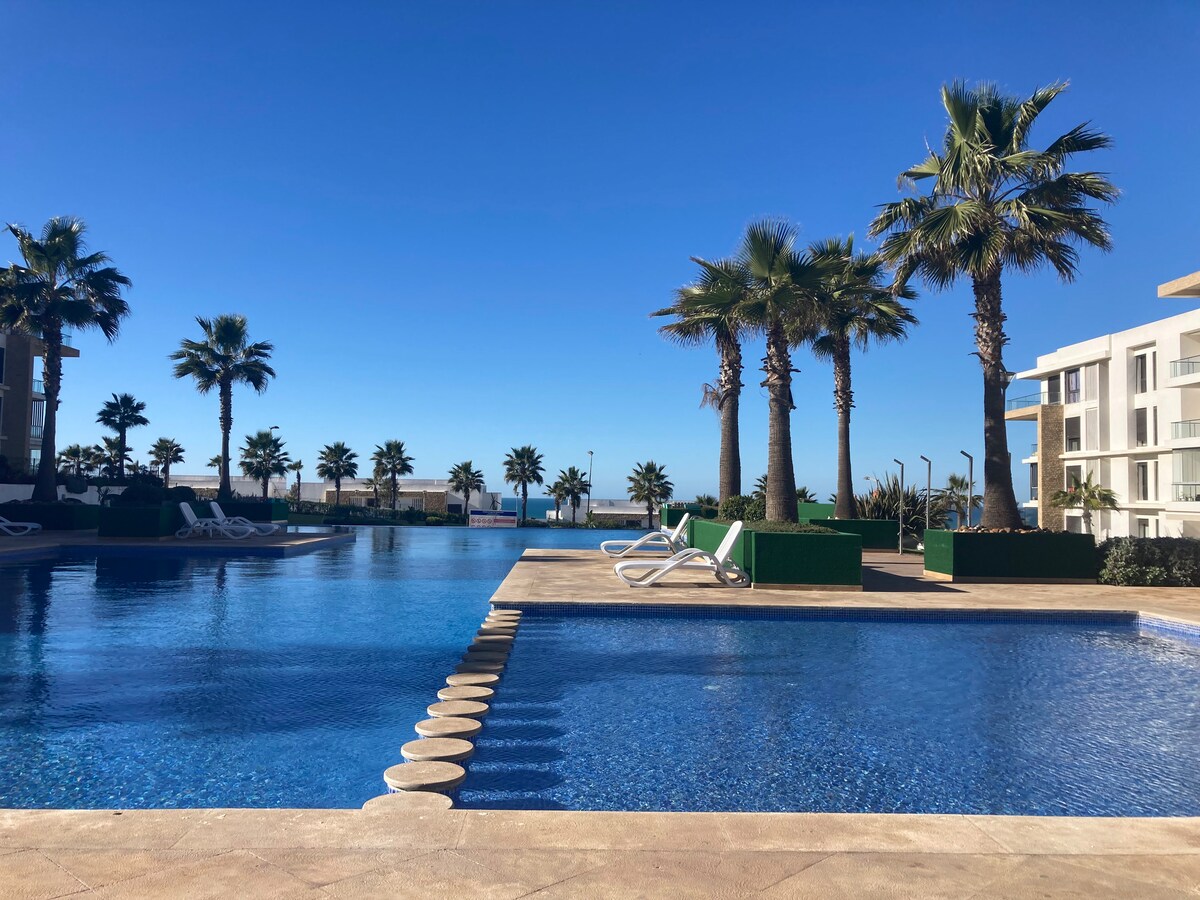 Appartement familial en front de mer – Prestigia Plage des Nations À 20 minutes de l’aéroport de Rabat-Salé. Le logement : -1 suite parentale avec salle de bain privée et balcon privé en front de mer -1 chambre avec deux lits simples -Salon spacieux, 1 personne peut y dormir si nécessaire -salle à manger -Cuisine équipée -Draps, serviettes, produits de base inclus -Wi-Fi / Télévision + IPTV -Place de parking privée -Piscine (fermé hors été), accès plage, aire de jeux Appartement Non-fumeur