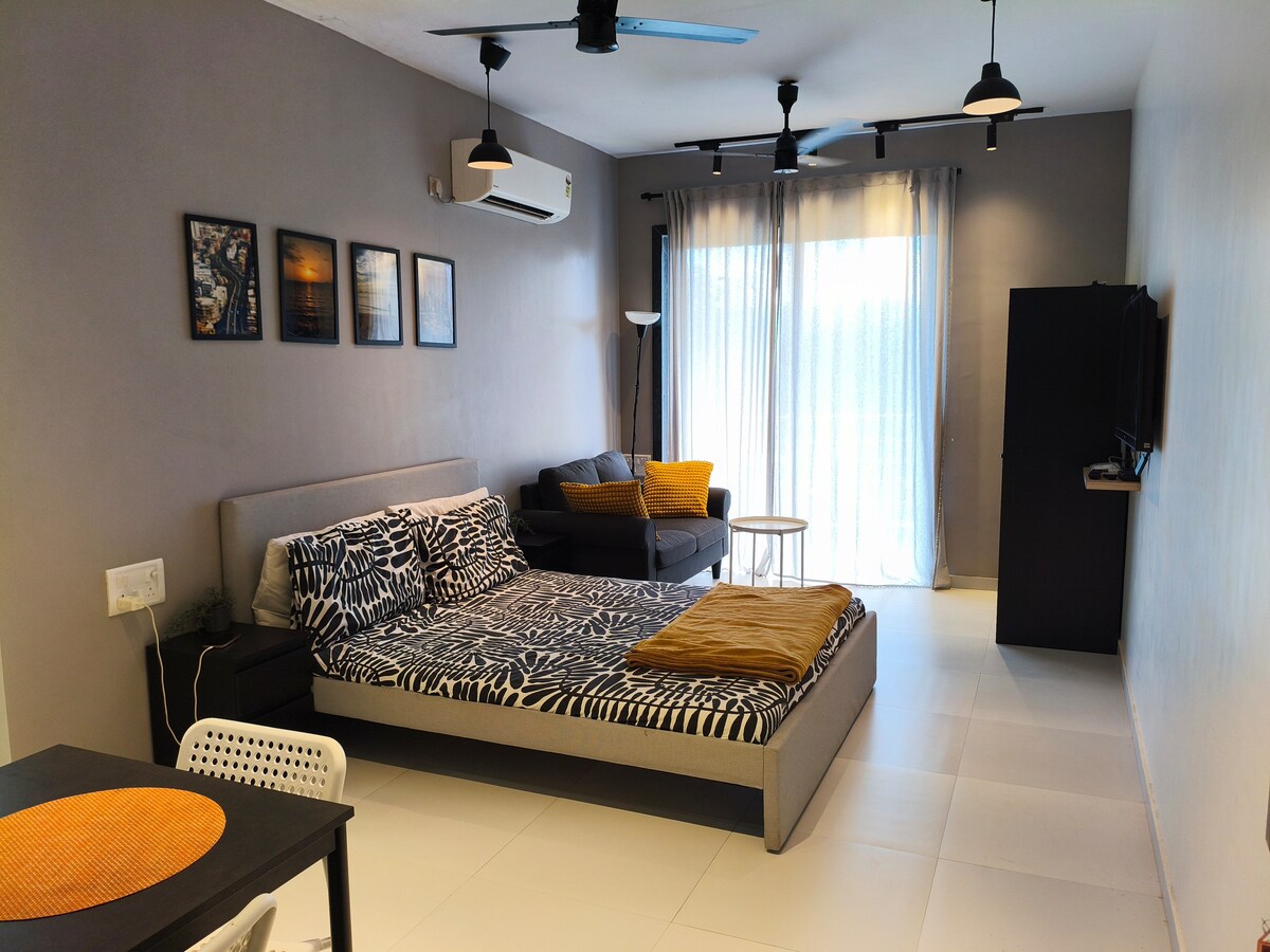 Boho Style Luxury Studio with Jacuzzi and Garden. A peaceful getaway. Fully loaded with WiFi, JBL 2.1 Home Theatre, BT Music System, Full-HD LED TV. A stylish bathroom with toiletries. Pantry with tea/coffee supplies, RO water, Microwave, Induction Hob, Fridge & s/w Toaster. Fenced garden for children. Dine in the garden with beautiful weather. Jacuzzi has hot water that can be used anytime. Common amenities on-site like swimming pool, games room, gym, mini theatre, cycling and restaurant.