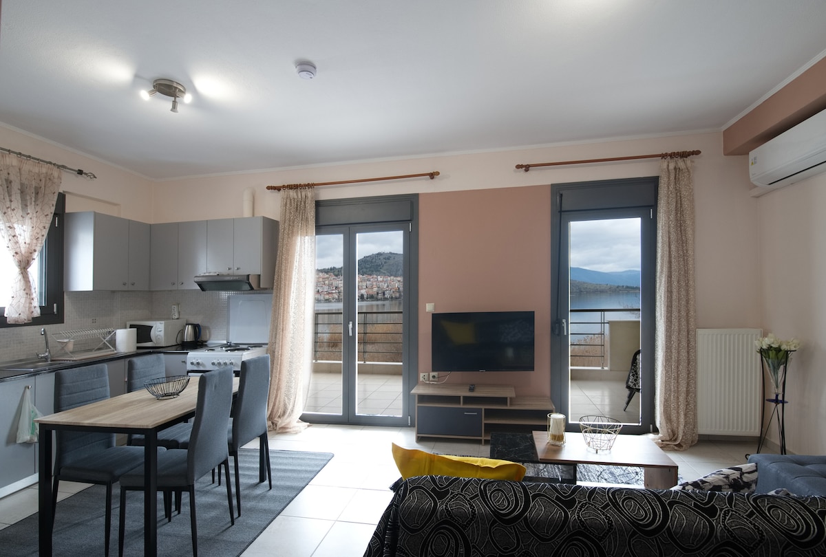 Studio tout neuf, chaleureux, joliment décoré, idéal pour les couples, avec une vue panoramique à couper le souffle sur le lac de Kastoria !!! Détendez-vous dans le lit king size et profitez de la vue magnifique ! Il est possible d'installer un lit pliant supplémentaire pour accueillir une personne supplémentaire. Il dispose d'un petit salon et d'une cuisine entièrement équipée avec four, plaques de cuisson, réfrigérateur, grille-pain, bouilloire, etc. Il est situé à seulement 150 m du centre-ville. Un parking gratuit est disponible.