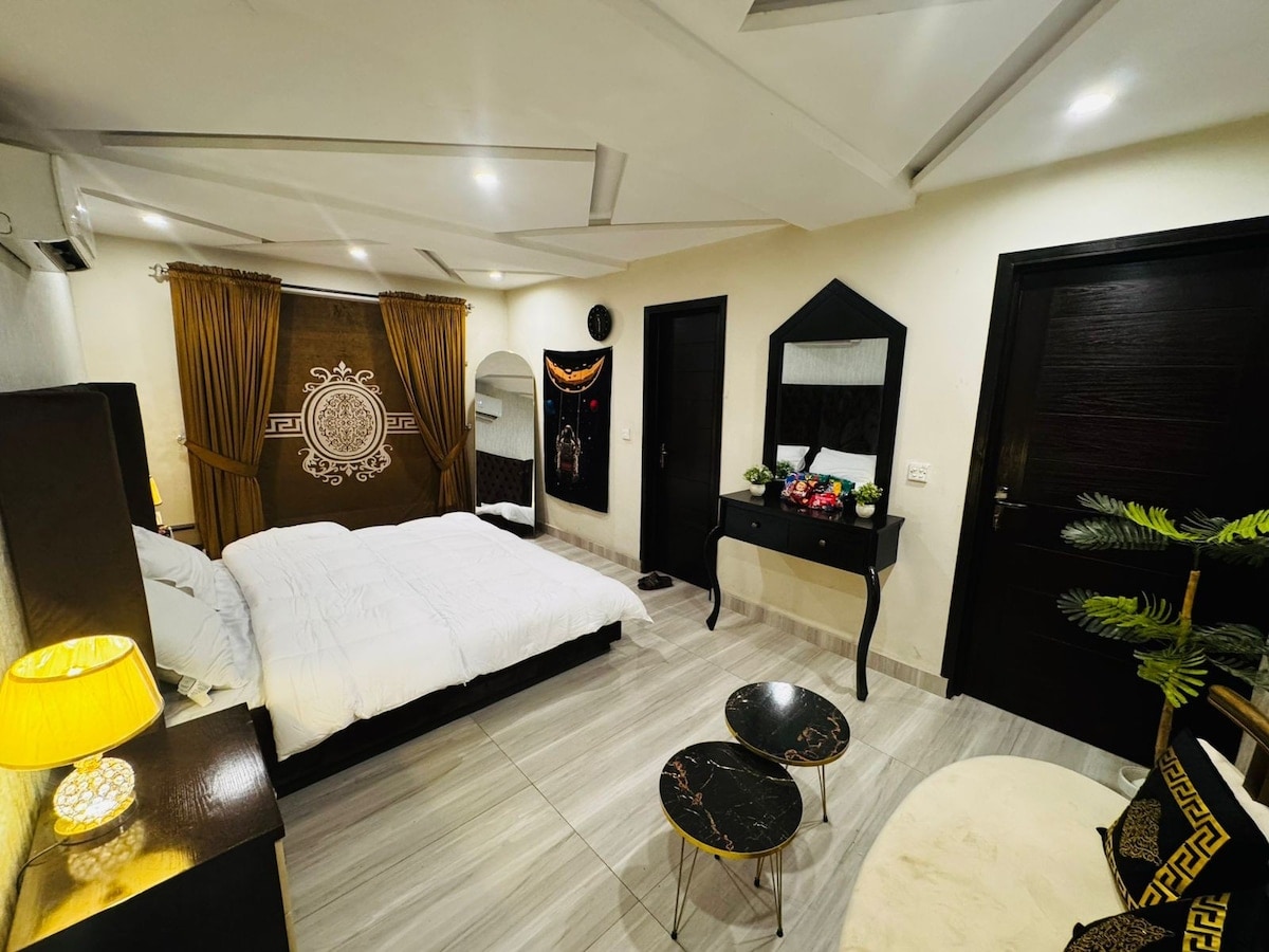 Bienvenue chez Stay Luxs 1 Appartement de luxe 1 pièce de style américain avec 🌟 vue imprenable de jour comme de nuit — Idéal pour les couples, les amis, les femmes voyageant seules et les familles. Situé au cœur de Bahria Town Lahore, offrant une atmosphère paisible avec tous les éléments essentiels accessibles à pied. Emplacement privé sécurisé et sécurisé - Arrivée autonome avec code PIN ou carte - Double verrouillage intérieur pour votre tranquillité d'esprit - Sécurité 24 h/24, 7 j - Lit king size avec matelas à ressorts super doux - Chauffage et climatisation - Cuisine sèche uniquement ;