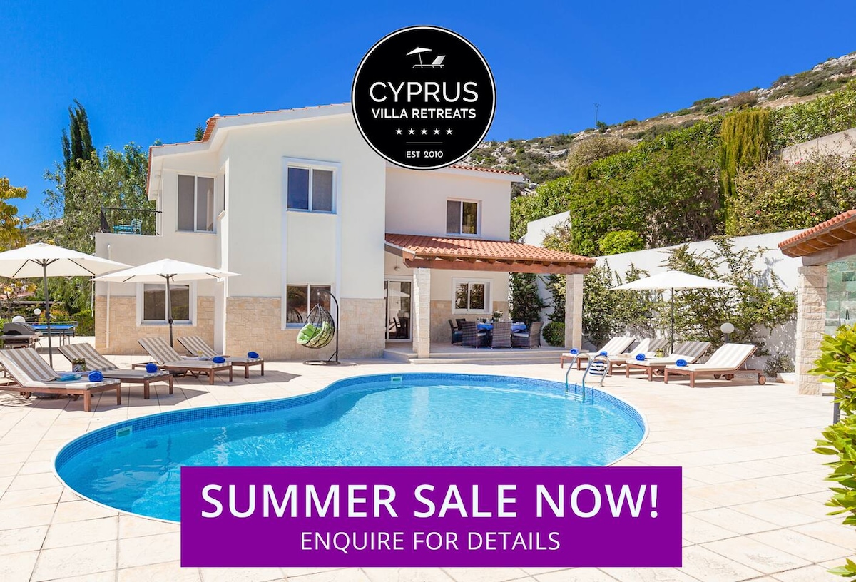 Take it easy at this unique and tranquil getaway with breathtaking views of the Coast of Paphos all the way from Geroskipou to Coral Bay. The villa is on the outskirts of the village of Tsada in rural Paphos and very well located for guests who wish to explore the Paphos region and city. The villa is 5km from Minthis Hills Golf Resort, 12km from Paphos City, 28Km from Latchi Bay and 18km from Coral Bay.