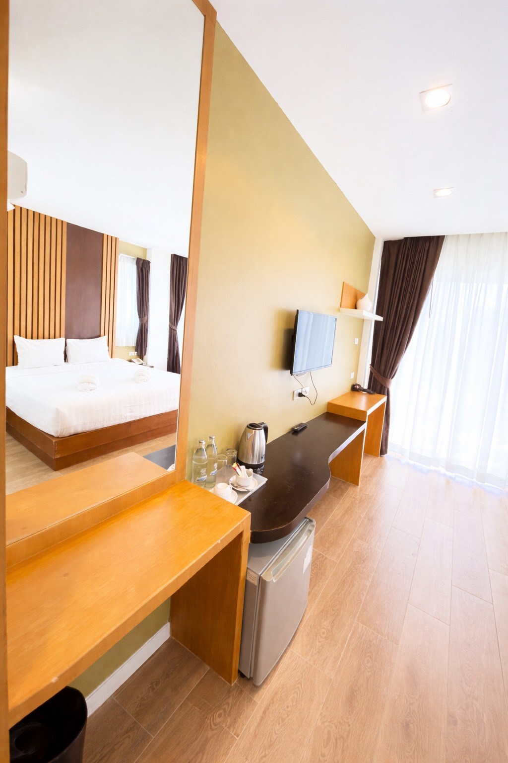 Cette chambre est de 36 m ², entièrement meublée avec un lit queen-size, et équipée d'une CONNEXION WI-FI gratuite, d'un climatiseur, d'un petit réfrigérateur, d'une armoire, d'une télévision à écran LCD 32", d'une télévision par câble par satellite, d'une salle de bain privée avec douche chaude et froide. Toutes les chambres ont des balcons privés avec vue locale sur Muang Phuket, une vue sur la montagne et la vue sur le Grand Bouddha sur la montagne. Le magasin pratique tel que 7eleven minimart, Supercheap le grand minimart local est à proximité pour marcher à seulement 2 minutes. Le service de blanchisserie situé à côté donc très pratique.