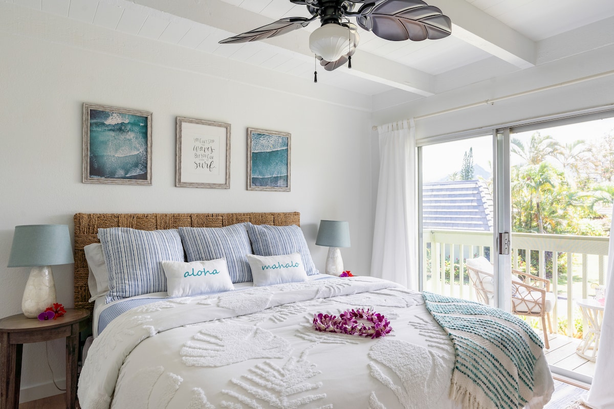 Maintenant avec climatisation - maison de ville de style bungalow, spacieuse et lumineuse, sur la rive nord convoitée de Kauai. Profitez du lanai calme et relaxant entouré de verts insulaires luxuriants ou faites un plongeon dans la piscine du quartier. Espace de vie ouvert et deux chambres avec salle de bains privée et lanais. Littéralement à quelques pas des vues sur le lever du soleil et du sentier de Wyllie Beach. Faites du vélo jusqu'à Queens Bath, profitez des happy hours au coucher du soleil, des restaurants, des magasins et du yoga. À quelques minutes en voiture de Hanalei Bay, Anini Beach, Tunnels Beach et d'autres joyaux de la côte nord.