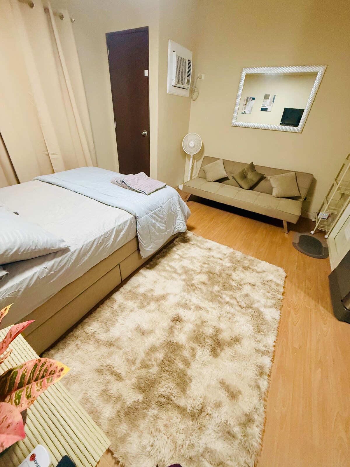 L'appartement est à distance de marche des restaurants, des boutiques, d'un hôpital et du centre commercial Ayala. Les environs sont sûrs. Il y a une sécurité 24h/24 et du personnel dans le hall. Il y a un ascenseur dans l'immeuble. L'intérieur du studio est chaleureux et confortable. Il est livré avec 2 lits doubles. Il peut accueillir jusqu'à 3 personnes. Une connexion Wi-Fi est fournie, idéale pour les appels Internet et la navigation sur le Web.